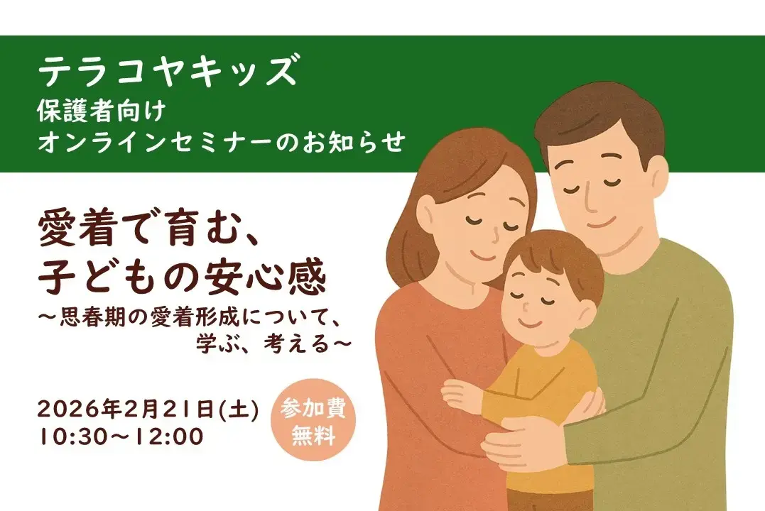 テラコヤキッズでは、「愛着で育む、子供の安心感~思春期の愛着形成について学ぶ・考える~」をテーマに保護者さま向けのオンラインセミナーを下記の日程で開催することになりました。