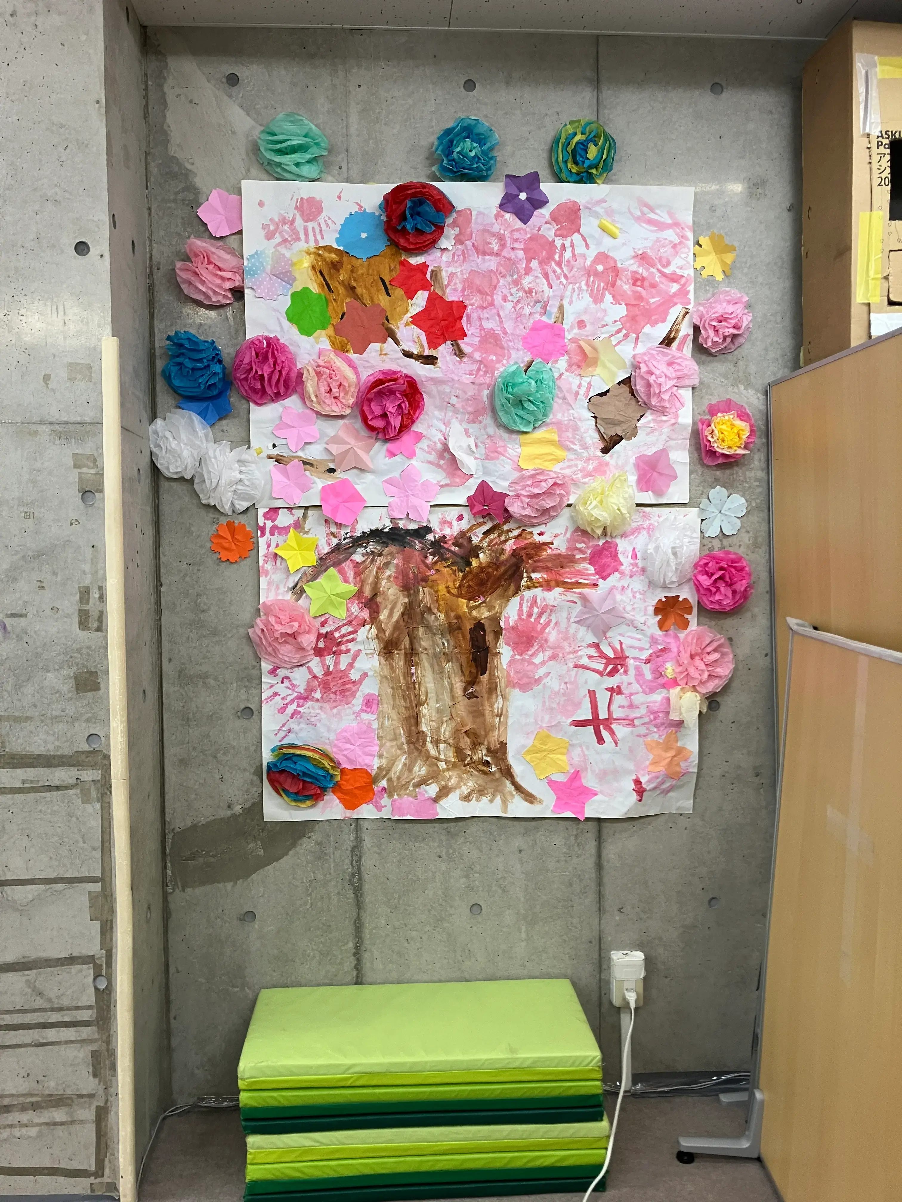 2026/04/03 【2026年3月 テラコヤキッズ川崎教室ブログ】桜の壁面工作 dandi 2026/04/03 【2026年3月 テラコヤキッズ川崎教室ブログ】桜の壁面工作 3月1週目の活動は工作で桜の壁面を作りました。 みなさんで協力して大きな桜を作っています。 下書きからお子様たちに取り組んで頂き、 絵の具で木の幹や桜の花を塗っています。桜の花は手のひらに筆で絵の具を塗り、模造紙につけて表現しました。 折り紙やお花紙でも桜の花を作って飾り付けました。 色とりどりの素敵な桜の木を完成させることが出来ました。