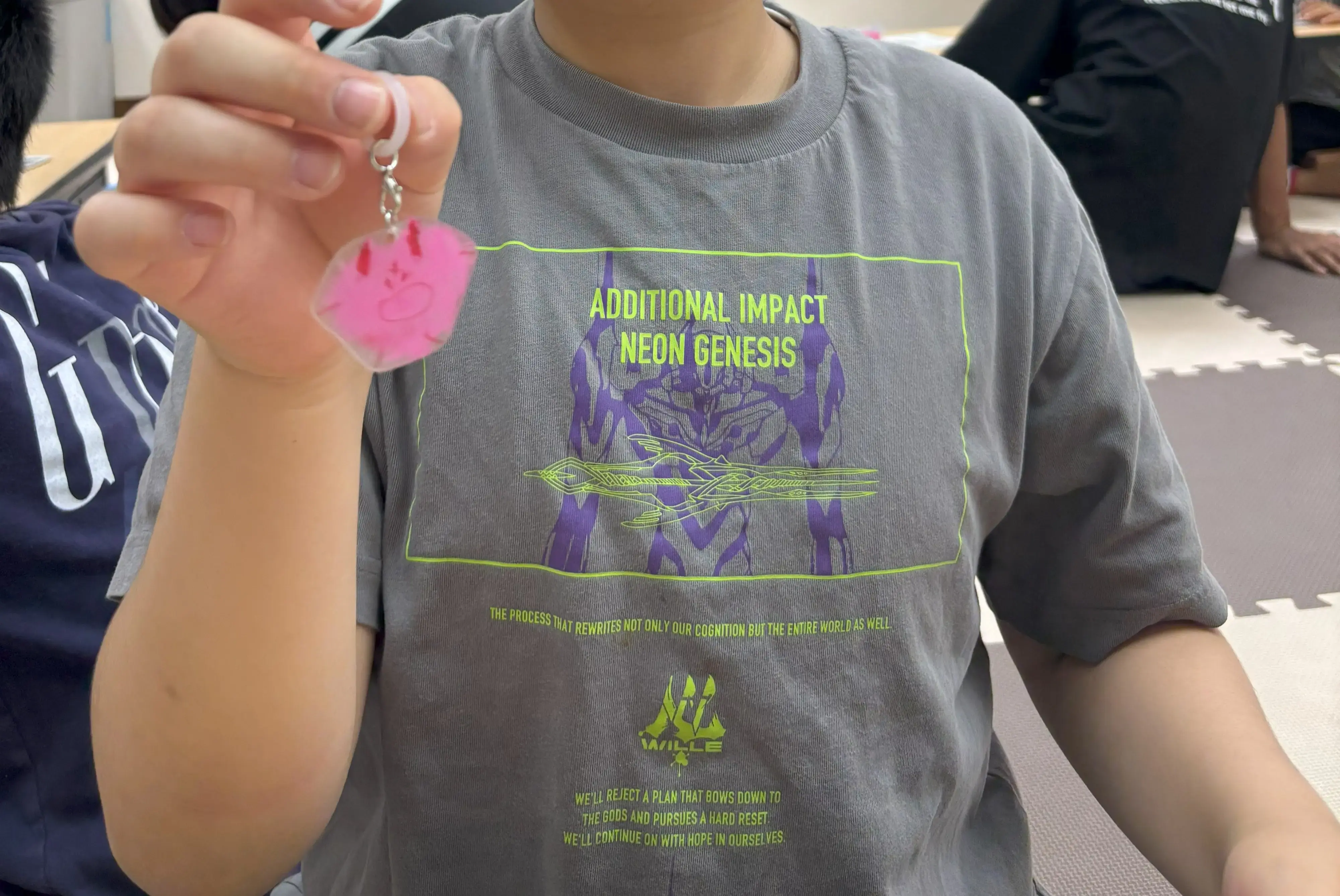 既存の型以外に作りたいものや形がある場合は指導員に声をかけてほしいことを説明すると、何人か自分の好きなキャラクターや絵を選びたいと指導員に話し、プラバンの中に納まるように考えながら作ることができていました。