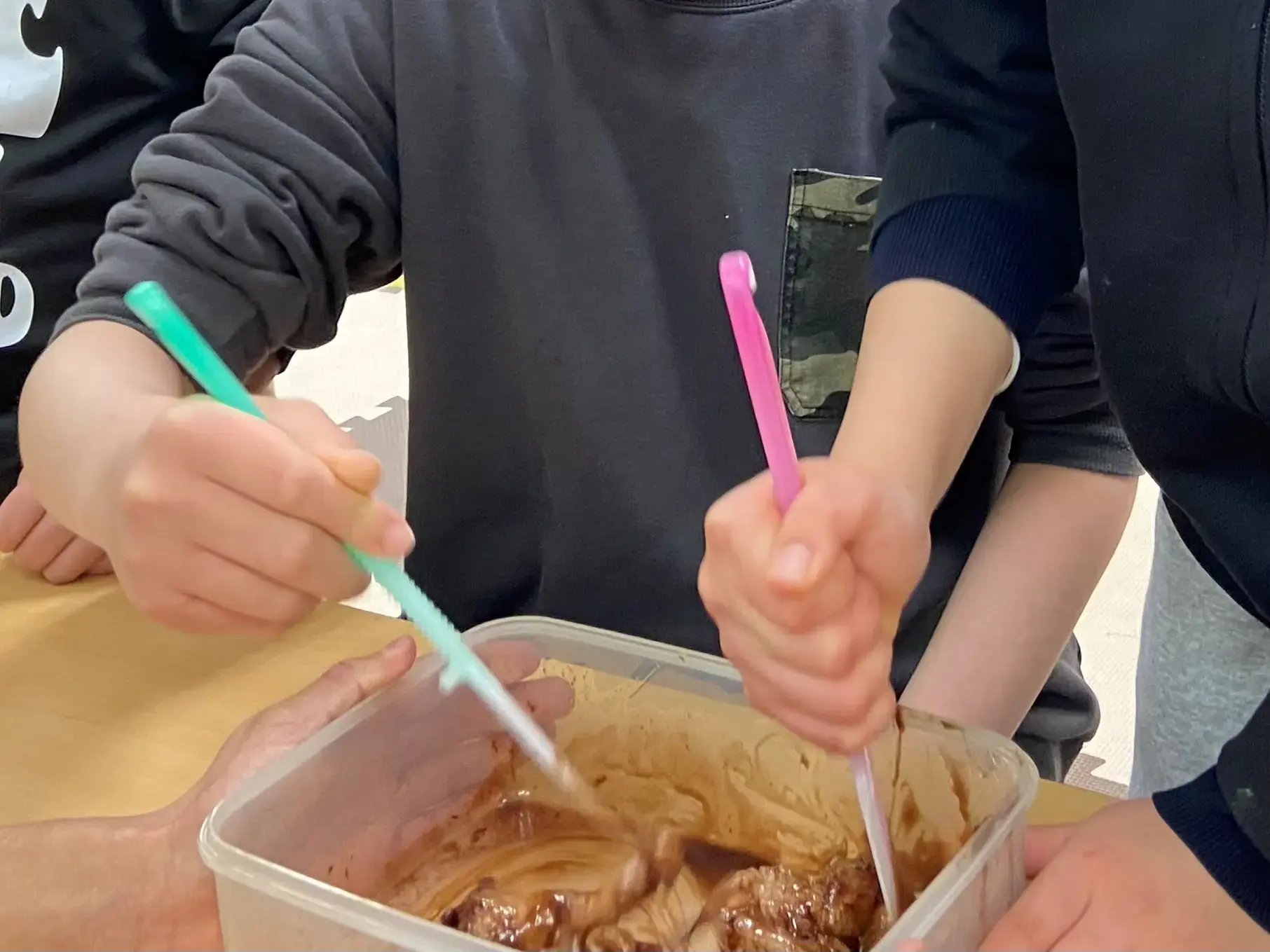 お餅を混ぜる際は、混ぜる人、容器を支える人など役割を決めながら作業を進め、お砂糖や牛乳を入れる際は小さじで何杯入れたかみんなで数えながら入れました。